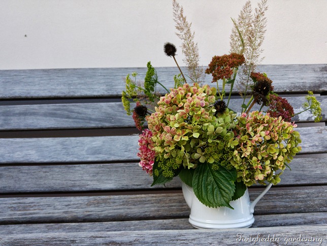 Accorciando gli steli qua e là, cercando di sistemare le ortensie nella parte bassa della composizione per lasciare i sedum e le corolle del prezzemolo a dare un po’ di slancio..